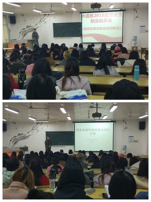 12月13日下午,外语系2018届毕业生就业动员大会在1411教室召开。会议由外语系党总支副书记、2014级辅导员葛巍老师和校就业指导中心蒋伶伶老师共同主讲,2014级英语、商务英语、翻译、越南语、泰语全体学生参加本次大会。