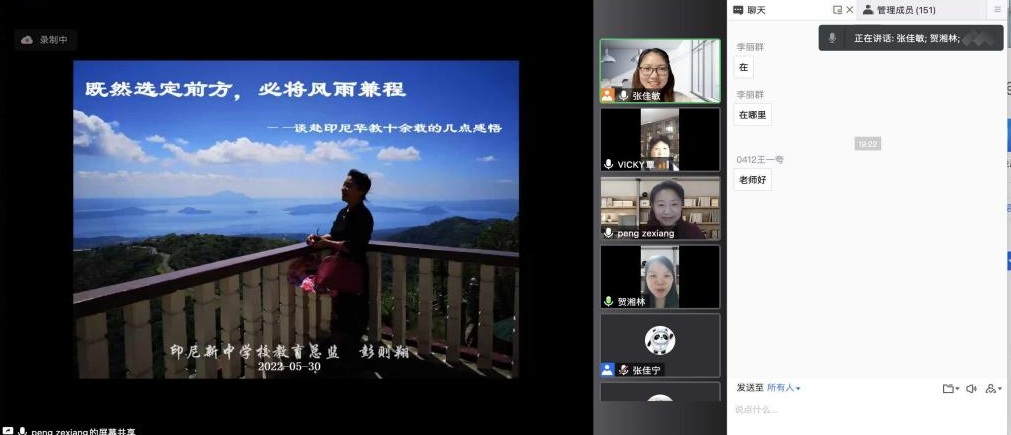 为积极响应我院“汉教之风”学术沙龙号召,帮助汉语国际教育专业学生拓宽国际汉语教学视野,5月30日晚,以“深耕华教笃前行,砥砺风雨终有成”为主题的学术沙龙讲座(第四期)在线上召开。本次讲座特邀现任印尼新中三语学校校务总监彭则翔老师对印尼汉语教育教学的相关知识进行分享。讲座由张佳敏老师主持,覃小禾副教授致辞,贺湘林老师总结,教研室全体教师及学生聆听讲座。