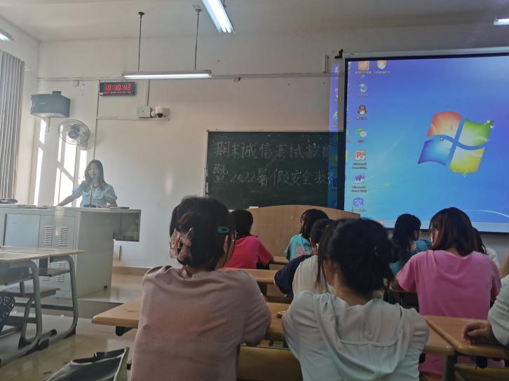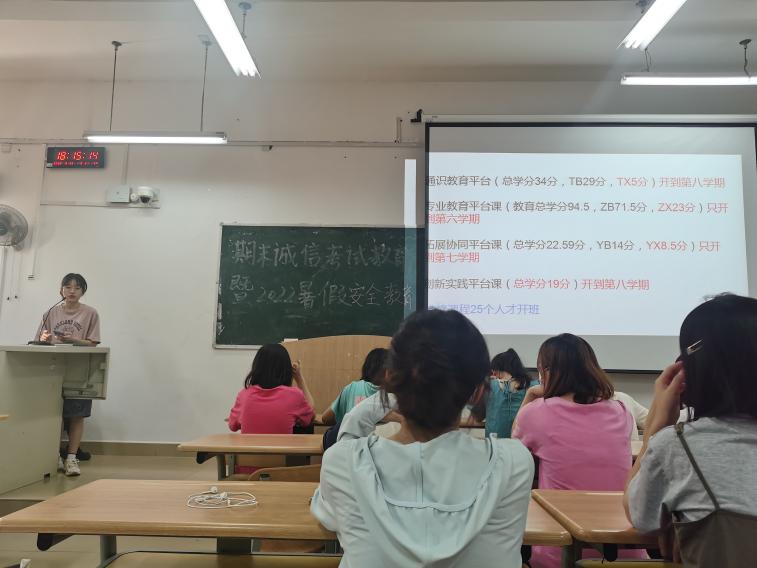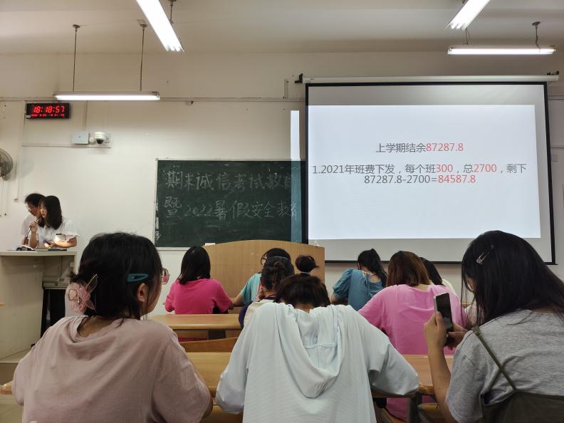 会议伊始,由辅导员闭彬彬老师对本学期开展的各项工作进行总结,闭老师强调了关于暑期安全工作的几点问题:一、放假工作安排。根据学校相关的文件要求,做好假期离校和开学返校工作。二、暑期安全问题。交通安全问题:出行要选择安全正规的交通工具,不搭乘手续不完备的“黑车”、个体运输车等各类非客运车辆,不乘坐超员车等存在严重安全隐患的车辆。人身和财物安全问题:增强安全防范意识,提高自我保护能力,防止电信诈骗、不良校园贷及被抢、被盗、被骗等事情的发生。防疫安全问题:要密切关注国内外疫情形势变化。减少不必要外出,非必要不前往国外和国内中高风险地区。防范自然灾害问题:进一步加强安全教育,提高学生安全意识,提升安全风险防范能力,培养学生良好的安全习惯。防范溺水安全问题:暑假期间,气温升高,天气炎热,禁止学生私自到江、河、湖、水库等水域游泳或游玩,强调学生本身要高度重视,切不可有丝毫的疏忽和侥幸心理。三、放假学习计划安排:暑假期间也要安排适当的时间进行教师资格证的备考学习,总结自己本学期的学习情况,并制定下个学期的学习规划。随后,由年级学习委员肖丽娜同学对本学期整体的年级学习情况进行汇报,通过详细讲解关于学分转换,课程选择等方面的内容,让同学们对自身的学习情况有了清楚的定位。接着,由年级生活委员林喜玲同学对本学期年级费用支出情况做了详细的汇报,从分到各班的班费以及书费和各种年级费用进行详细汇报,让同学们对年级费用情况有了一定的了解。