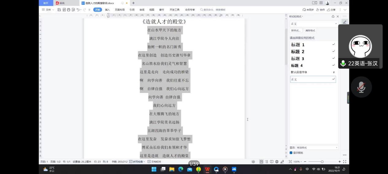 为秉承我校“向学、向善、自律、自强”的校训精神,进一步建设良好校园风气。10月11日晚,语言文学学院在线上开展以“学唱校歌《造就人才的殿堂》”为主题的活动。学院2020级汉语言文学专业学生代表刘童主持本次活动,2022级全体新生参加此次活动。