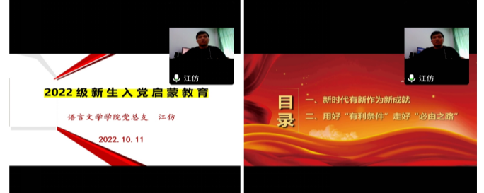 为进一步突出党的政治建设,落实立德树人根本任务,深化大学生理想信念教育,引领新生扣好入党“第一粒扣子”,实现党员发展早选苗、早教育、早衔接、早培养,引导新生提高政治觉悟与思想素质,积极向党组织靠拢。10月11日上午,语言文学学院在线上开展了2022级新生入党启蒙教育专题讲座。本次讲座由语言文学学院党总支书记江仿副教授担任主讲,学院2022级全体新生参加本次讲座。