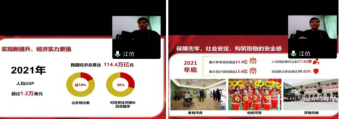 首先,江仿书记向全体新生详细讲解了中国共产党的性质、宗旨、路线、方针、奋斗目标和指导思想,使新生们加深对党组织的认识。其次,江仿书记提及“新时代大学生党员首先要做到信念坚定,始终具有马克思主义信仰、共产主义觉悟和中国特色社会主义信念,自觉践行社会主义核心价值观,牢固树立为共产主义事业奋斗终身的远大志向”的内容,提高新生们的思想觉悟,确立政治信仰和终身志向,增强争做一名共产党员的光荣感和责任感。接着,江仿书记通过新时代有新作为、社会主义现代化建设新时期的探索启示和中国特色社会主义新时代等方面的内容,深入浅出地介绍了中国共产党百年的光辉历程和取得的伟大成就,增强新生们的信念感、使命感。最后,江仿书记鼓励新生们学党史、坚信念,争做新时代的奋斗者和担当者。