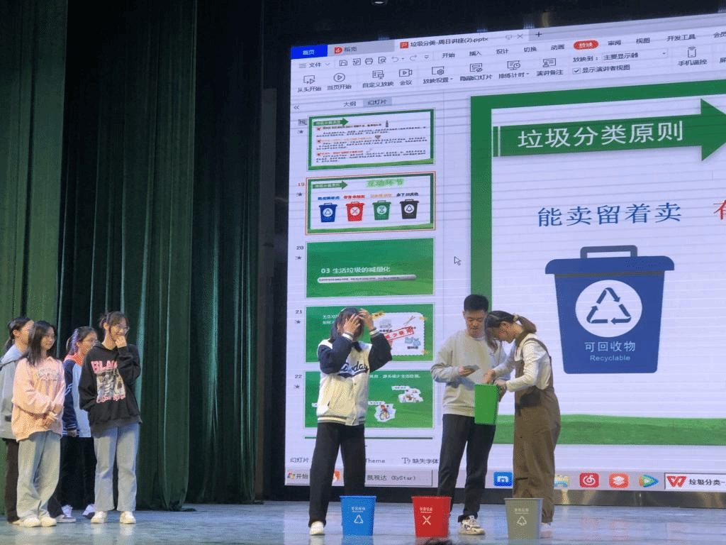 讲座开始,彭谦同学为同学们讲解了广西每年生产垃圾的产量,让同学们了解到目前垃圾处理的严峻形式,引导他们培养低量投放的生活理念。接着,她从垃圾分类的原因、如何分类垃圾和垃圾分类的原则三个方面,向同学们分析了不同种类垃圾的危害性,以及垃圾分类对减轻环境污染、减少疾病传播、节约资源的意义。随后,她随机邀请四名同学上台进行垃圾分类的互动测试,使同学们对垃圾分类的知识有了更全面、更深刻的认识。