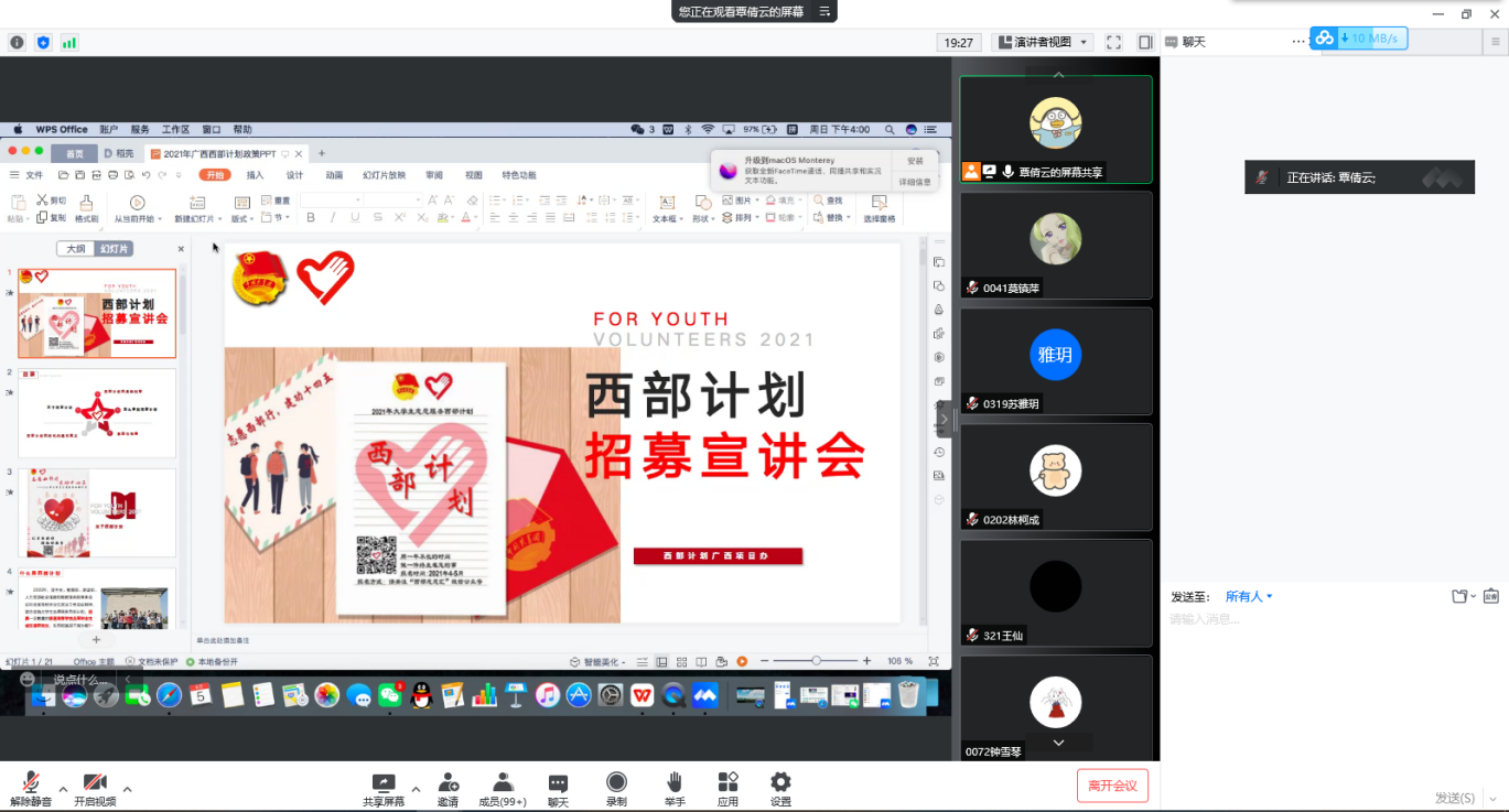 10月20日,2019级汉语言文学思想政治辅导员覃倩云老师开展线上主题讲座,从西部计划的基本含义、时代意义、具体内容、相关政策及报名事项等,介绍西部计划的相关内容。