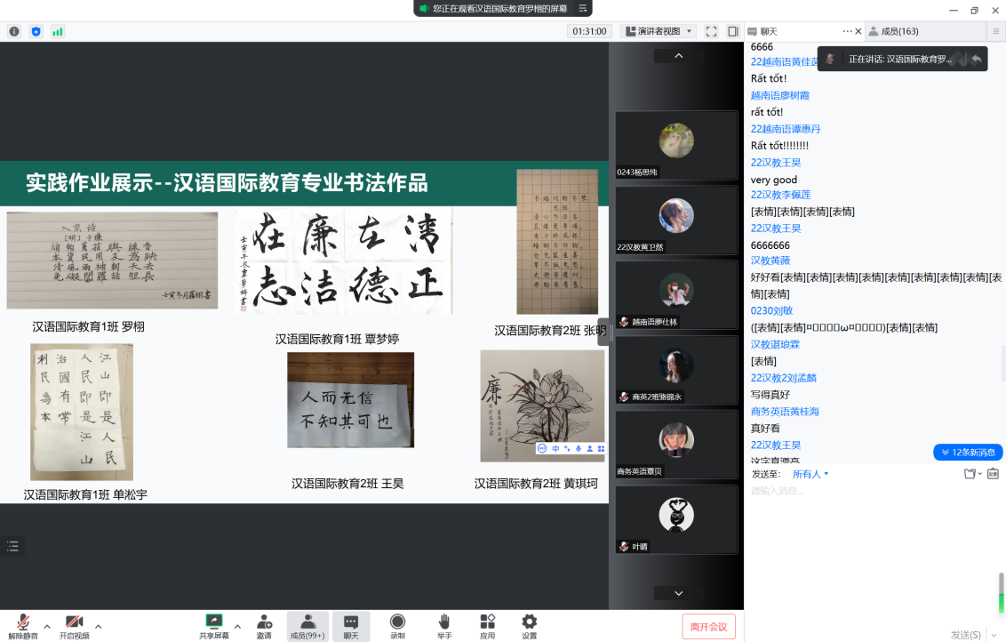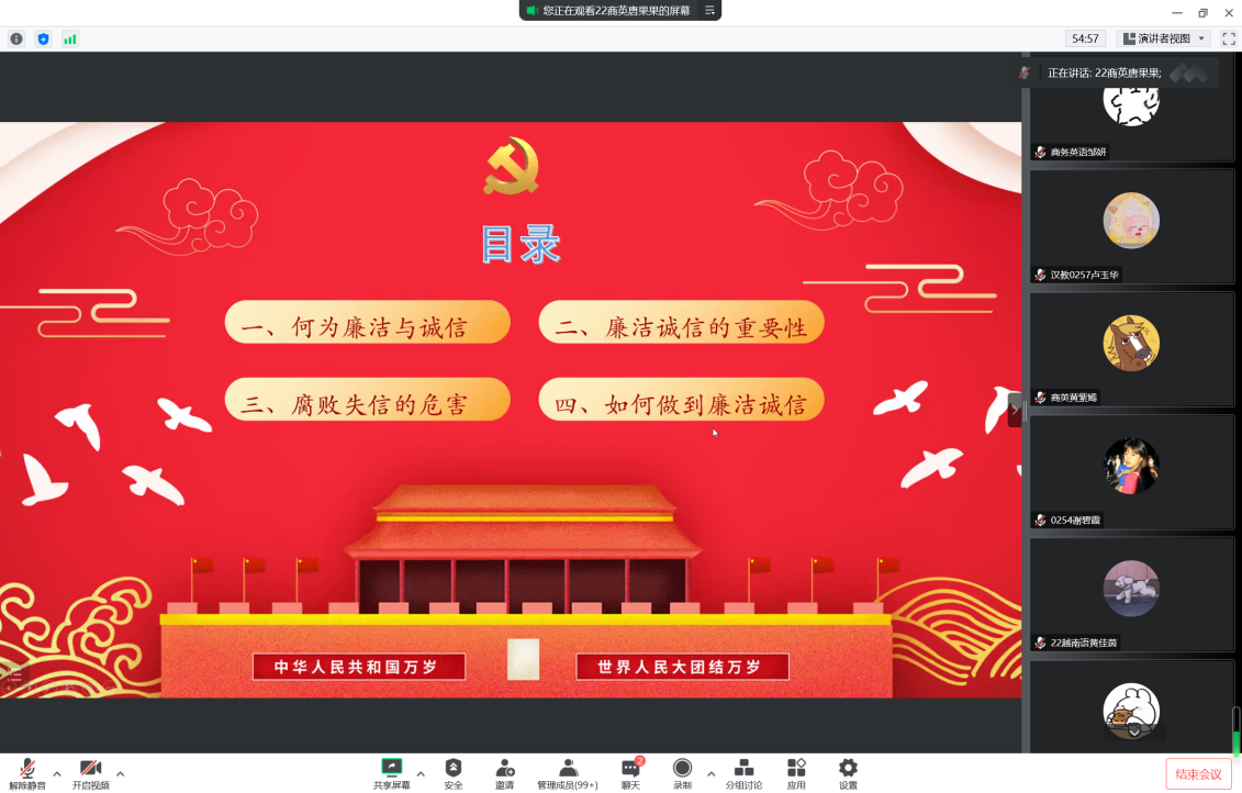 高校既肩负着为党育人、为国育才的光荣使命,也是推进廉洁建设的重要阵地。按照我院入学教育工作安排,并结合学院实际,2022年12月,我院集中开展以“弘扬清风正气,激励担当作为”为主题的廉洁教育活动。活动期间,我院2022级各专业,分别结合专业特色,在专业辅导员的引导下,以线上班会的形式,通过书法展示、英文拼贴诗、廉洁视频观看、廉洁故事分享等内容感悟廉洁文化。