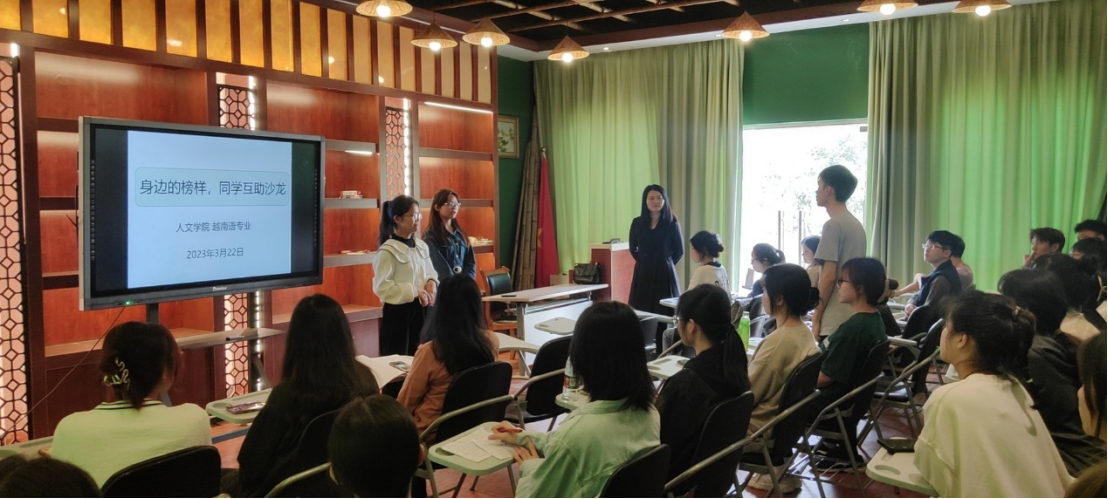 近日,为了进一步加强人文学院的德育工作,充分展示我院学生的精神风貌,发挥榜样的模范带头作用,创设积极向上的学习氛围,鼓励和激发广大学生向身边的榜样学习,带动更多的同学共同进步。人文学院越南语专业在越南馆召开了“身边的榜样,同学互助沙龙”主题交流会。参加此次活动的有学院领导、越南语专业教师代表、2020、2021级越南语专业优秀学生代表以及2022级越南语专业全体同学。