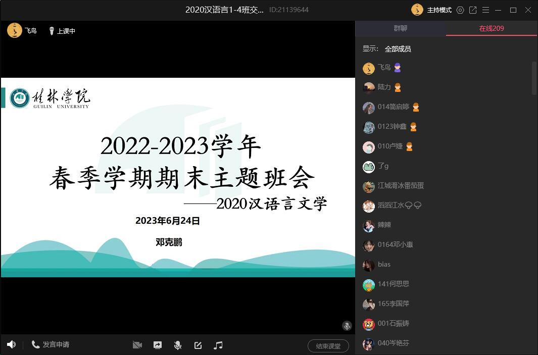 6月24晚,人文学院2020级汉语言文学专业开展2022-2023学年春季学期期末安全教育系列主题班会。2020级汉语言文学专业两百余位同学参会,辅导员邓克鹏主持会议并做期末总结。