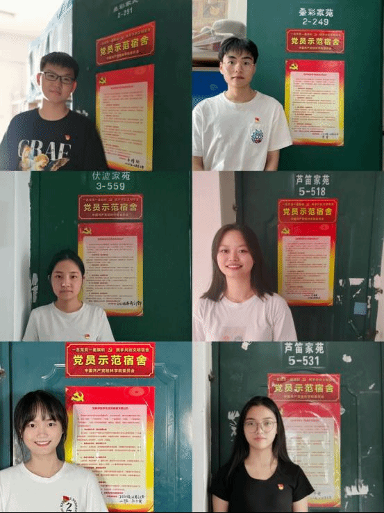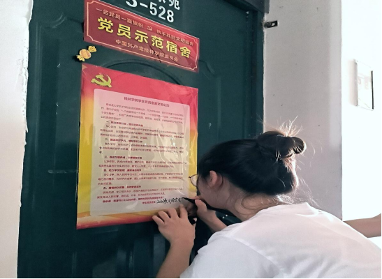 图:学生党员自觉张贴“党员示范宿舍”牌和《桂林学院学生党员宿舍文明公约》