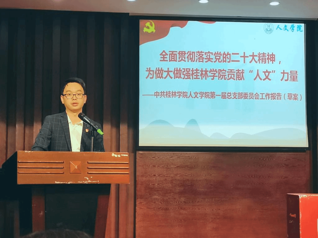 随后,人文学院党总支书记、副院长庞一飞代表学院上一届党总支作工作报告。报告以《全面贯彻落实党的二十大精神,为做大做强桂林学院贡献“人文”力量》为题,对上一届党总支工作进行了全面的回顾,总结了取得了成绩,也指出了存在的不足。报告紧紧围绕学校第一次党代会确定的中心任务,以实现做大做强桂林学院为目标,结合学院实际,提出了今后工作的主要任务和思路:一是坚持立德树人,大力培养“至善”莘莘学子;二是强化师德师风建设,培育高质量“至善”师资队伍;三是深化“至善”教学改革,做强学院学科专业建设;四是推进“至善”依法治院,共建清廉和谐平安人文;五是落实全面从严治党,夯实“345”党建工作机制。