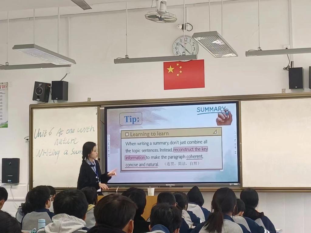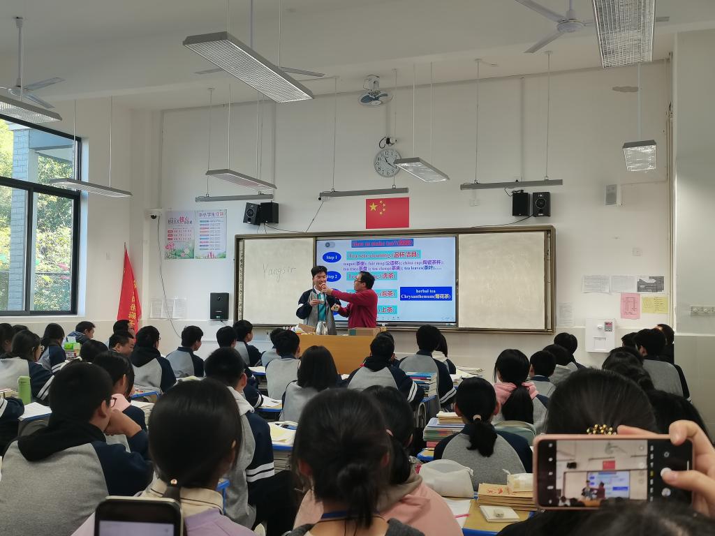 现场授课分别由宏谋中学教研组长阳文山和学校2020级实习生陆艾己完成。阳文山利用视频导入新课,充分激发学生的学习兴趣。课堂内容设计精妙,层次分明的完成了阅读部分的教学任务,自然的过渡到写作部分的讲解,其内容简洁、明了、易懂,让学生高度参与课堂。最后,让学生实际体验泡茶的步骤,增进对茶道文化的理解,提升学生的文化意识。陆艾己通过学生熟悉的语篇自然引入主题,带领学生归纳总结概要写作的要点,鼓励学生独立思考,提高学生解决问题的能力,体现学生的主体与教师的主导作用。