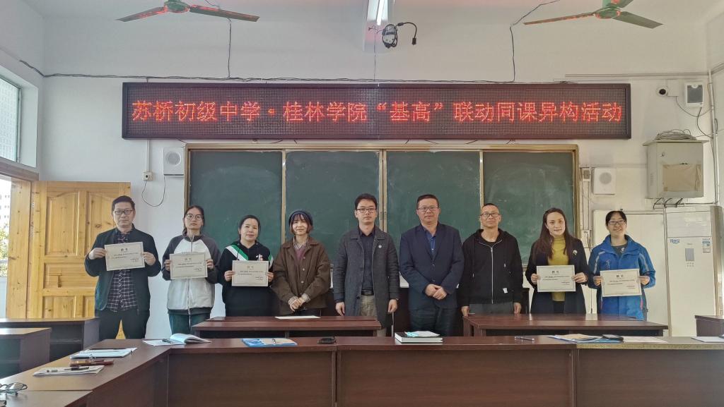 习与智长,化与心成。为加深学校之间的交流合作,为师范生提供专业的锻炼平台,提升学生专业素养和教学水平,11月21日,人文学院与永福县苏桥初级中学开展“基高”联动同课异构活动。苏桥初级中学校长龚阳昆、人文学院党总支书记庞一飞、苏桥初级中学语文组老师、人文学院汉语言文学专业指导老师以及全体实习生参加了本次教研活动。
