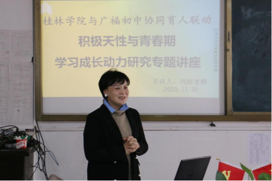 为全面贯彻党的教育方针,落实立德树人根本任务,培养德智体美劳全面发展的社会主义建设者和接班人,11月30日,人文学院赴永福县百寿初中、广福初中开展“积极天性与青春期学生成长动力研究”协同育人专题讲座。百寿初中校长黄富渊、广福初中校长卢开连分别主持讲座。两所学校全体教师、人文学院教授潘冠海及实习生参加讲座。讲座由人文学院教师刘浈主讲。