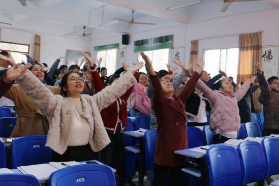 百寿初中教师们跟随刘浈放松身体(黄思颖/摄)