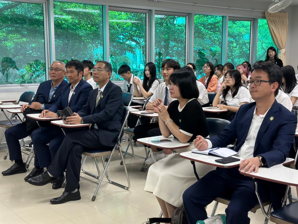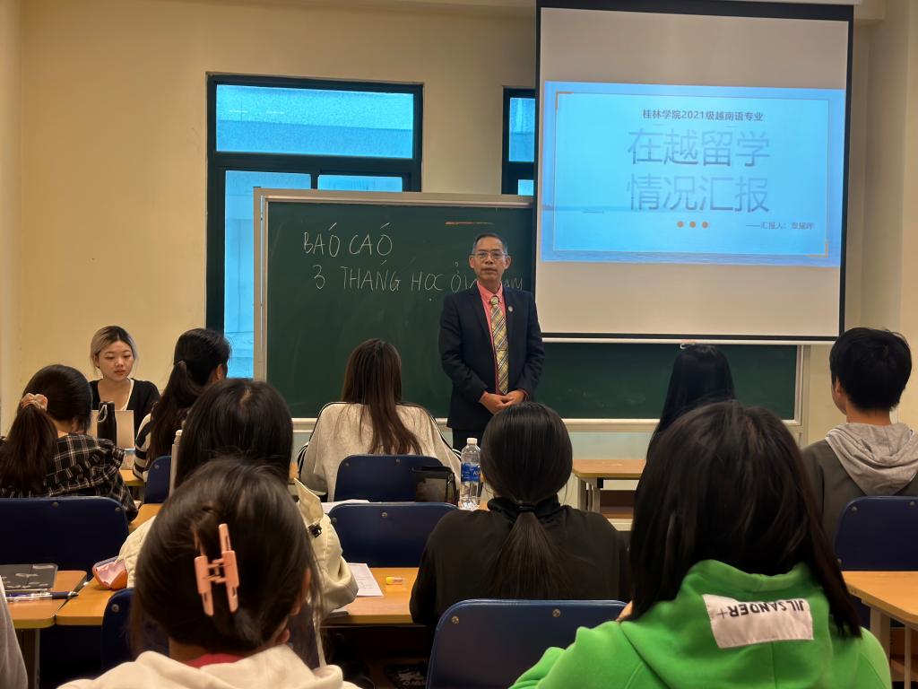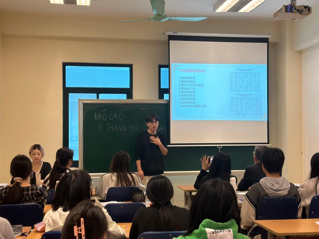 考察团一行认真观摩了学生上课的情况,听取了学生代表的汇报。2021级越南语专业学生覃耀晖、泰语专业学生湛维益、商务英语专业学生杨金潮、汉语国际教育专业学生张语彤4位同学分别向学校领导汇报了本专业学生在国外留学、实习的具体情况。