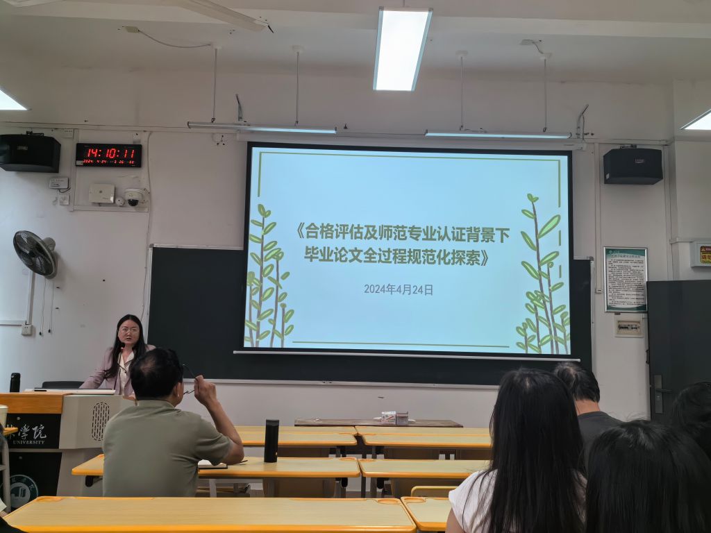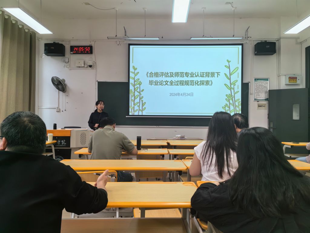 4月24日,人文学院开展了题为《合格评估及师范专业认证背景下毕业论文全过程规范化探索》的研讨活动,人文学院院长莫其逊及中文类专业全体教师参加活动,活动由副院长陈锴主持。