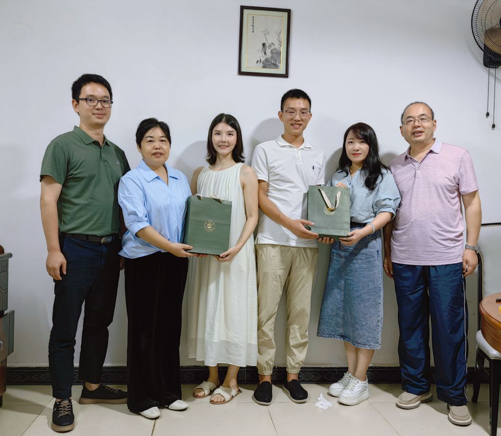 何玲与参加交流人员向洪腾辉(右三)、刘灵娟(左三)赠送校友纪念品