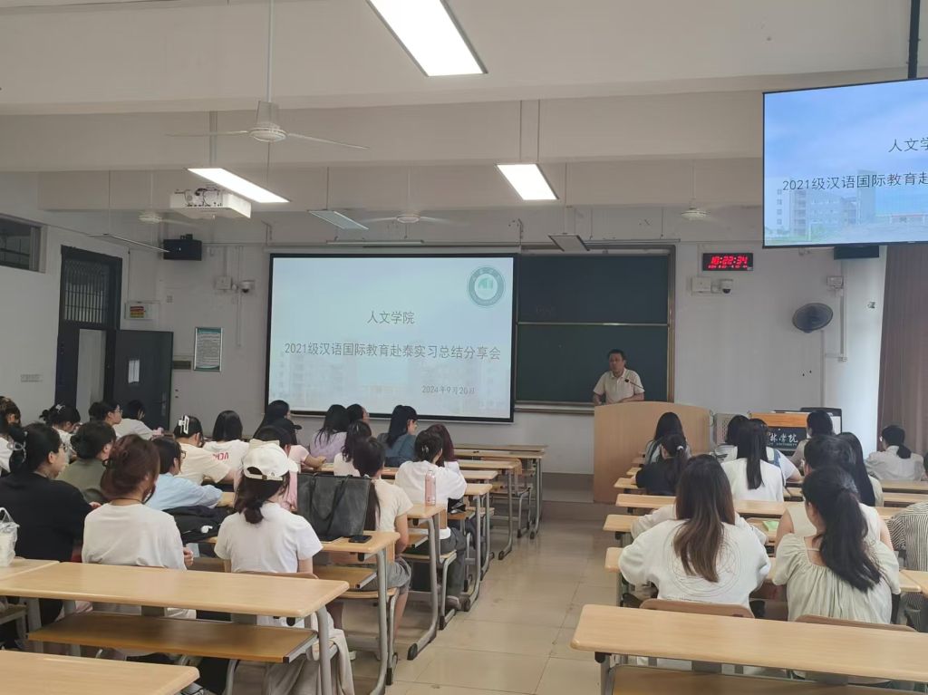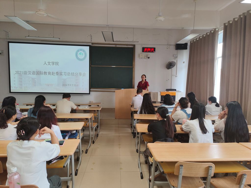 为提高学生实践能力,促进共同成长,让学生在就业之路上走得更稳。9月20日上午,人文学院在1402教室召开2021级汉语国际教育赴泰实习生实习总结大会。本次会议由带队老师钟锟主持,院长、副院长出席会议并讲话,语言学及国际中文教育教研室全体教师、辅导员以及2022级汉语国际教育专业学生参加会议。