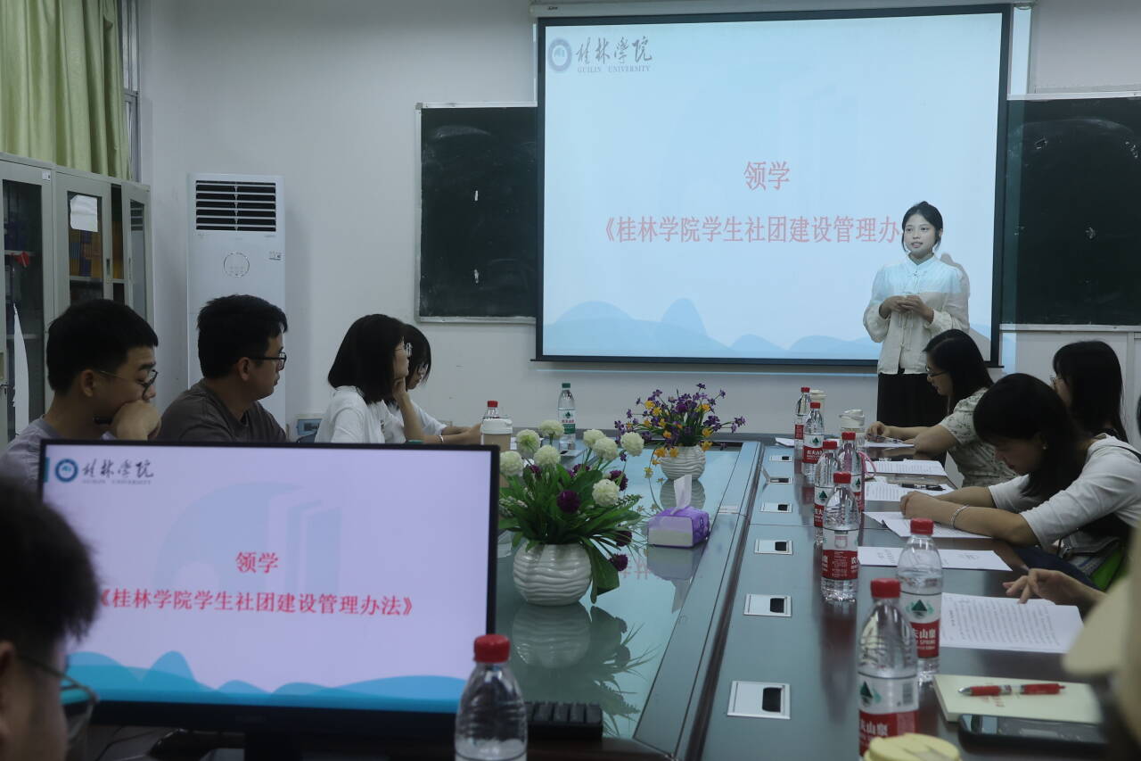 紧接着,学院团总支副书记领学《桂林学院学生社团建设管理办法》,主要围绕注册登记、指导教师、组织建设、活动管理、工作保障等方面展开讲解,明确了加强学生社团管理工作的重要意义和要求。随后,各学生社团主要围绕社团招新情况、本学期社团活动规划安排及存在的困难等进行交流讨论。