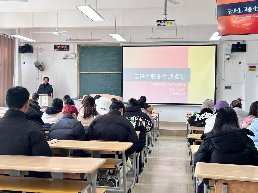 12月21日下午,人文学院泰语专业教研室在1313教室为2024届泰语专业毕业生举行就业指导并进行专场招聘。广西南宁雅达通翻译服务有限公司总经理、广西泰语资深翻译专家宋志寿老师受邀出席,并作《泰语专业学生职业生涯规划》主题讲座。泰语专业全体师生参加活动。