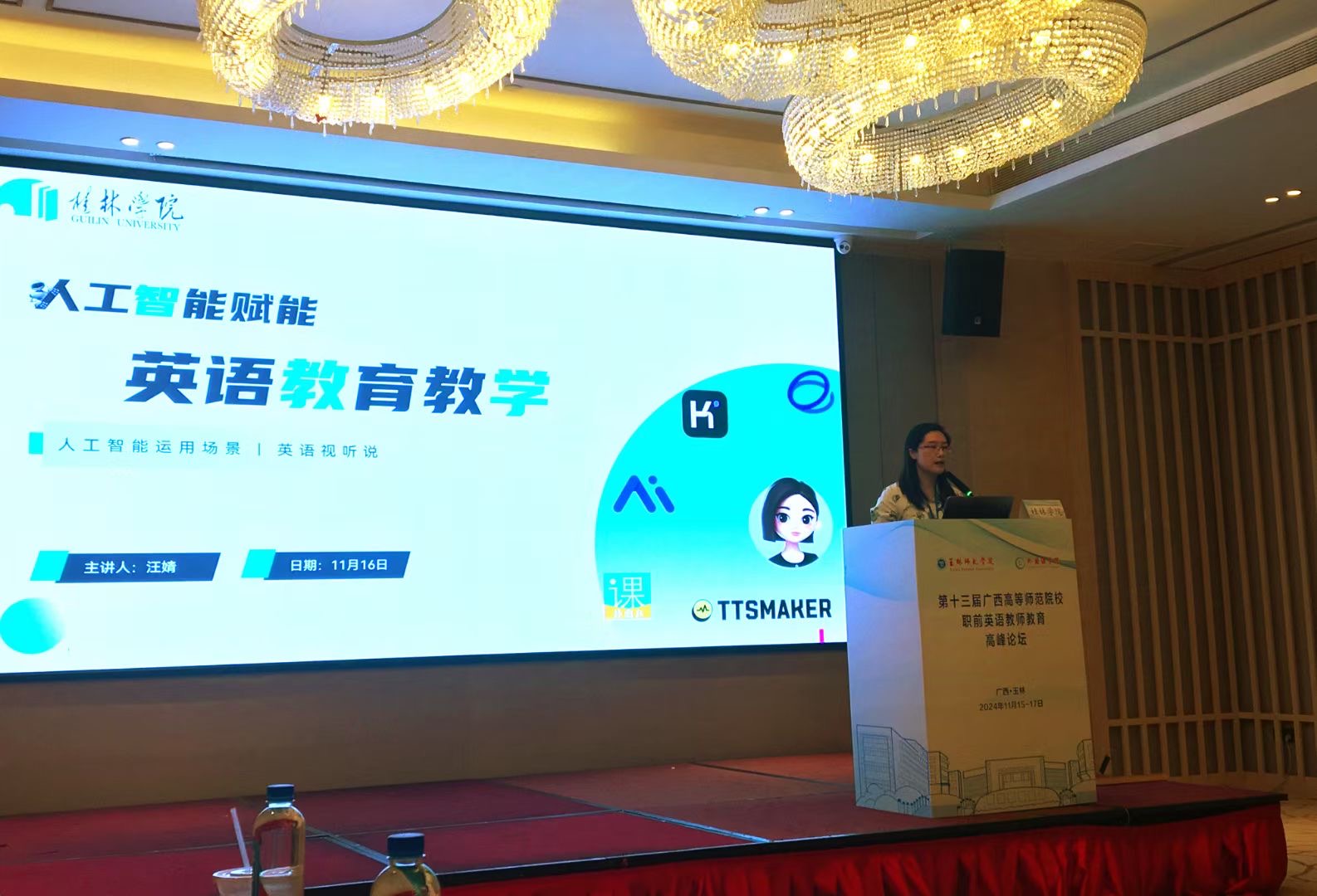 第二部分由参会院校围绕本次论坛主题交流发言,参会的13所院校分享了各自在数智时代英语学科育人新路径、数智时代的高质量外语教师教育队伍建设、课程体系建设等方面的经验。英语专业骨干教师汪婧副教授在论坛上做了《人工智能赋能英语教育教学》的交流发言,以视听说教学为例,结合具体的案例,为人工智能赋能英语教学提出了优秀范例,受到了参会院校老师们的关注和好评。