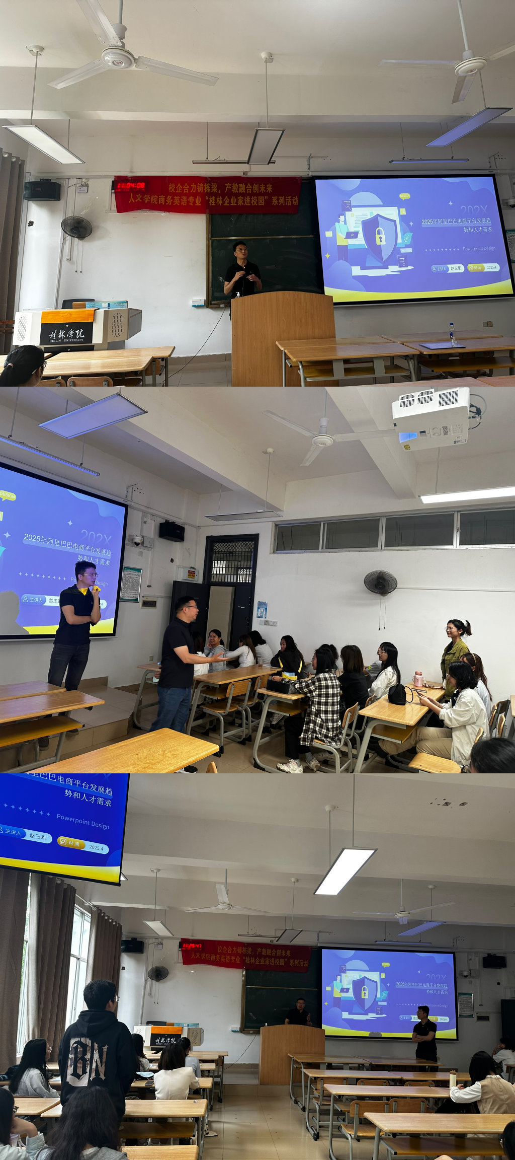 随后,企业导师们在至善楼1315教室与商务英语专业师生代表进行交流分享。桂林三特家居用品有限公司总经理李宇成以《外贸行业发展与复合型人才需求》为题,结合企业出海案例,剖析了跨境电商、跨文化沟通等领域的岗位能力要求,提出“外语+商务+实践”的人才培养建议。广西易贸通网络科技有限公司总经理赵玉军则聚焦《中国电商趋势与就业新机遇》,通过数据分析解读直播电商、跨境供应链等新兴业态的发展方向,鼓励学生夯实数字技能与创新思维。两位导师的分享深入浅出,现场掌声不断。互动环节中,学生围绕职业规划、行业挑战等话题踊跃提问,导师结合自身经历逐一解答,气氛热烈。