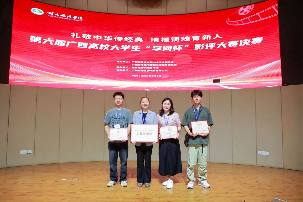 6月1日,以“礼敬中华传经典 培根铸魂育新人”为主题的第六届广西高校大学生“学问杯”影评大赛决赛在桂林旅游学院图书馆成功举行。本次大赛由广西高教学会图书馆专业委员会和广西高校图书情报工作指导委员会主办,桂林旅游学院承办,广州红霖信息科技有限公司协办。我院晋级决赛的2022级汉语言文学专业王清合同学荣获本科院校组三等奖。