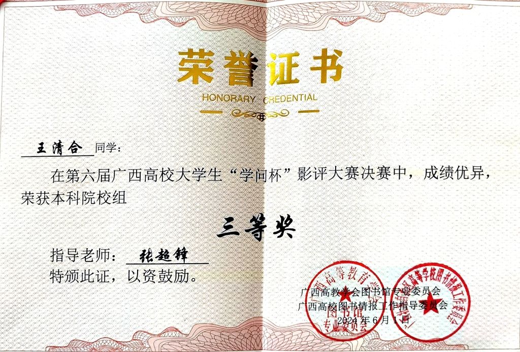 广西高校大学生“学问杯”影评大赛旨在深入挖掘中华优秀传统文化价值内涵,推进全民阅读,提高人文素养,增强文化自信,强化大学生爱国主义教育。为激发学生创造力和想象空间,营造浓厚的书香校园氛围,学院积极指导学生参赛,共有24人在校赛中获奖,在全院营造了良好的育人氛围。