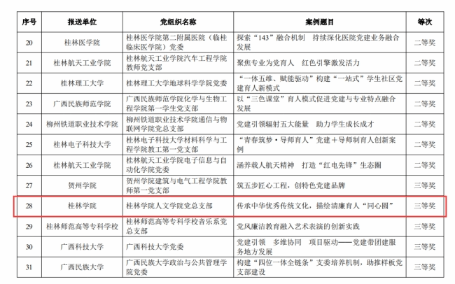 近日,中共广西区委教育工委公布了全区教育系统推进党建与事业发展“一融双高 ”创新典型案例获奖名单,学院党总支报送的《传承中华优秀传统文化,描绘清廉育人“ 同心圆 ”》案例获得自治区“一融双高 ”创新典型案例高校组三等奖,系全校唯一获奖的作品。