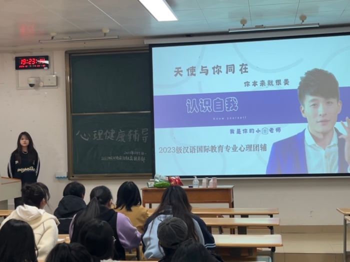 人者智,自知者明;胜人者有力,自胜者强。为全面提升新生心理的自我调控和适应能力,接纳自身不足,学院2023级汉语国际教育团支部于12月9日开展了以“认识自我”为主题的心理健康辅导活动。本次活动由心理委员白欣雨主讲,全体学生参加活动。