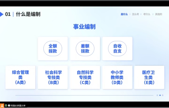 紧接着,周磊同学进行了关于编制考试的经验分享。主要是从编制考试是什么、怎么考、考什么等方面进行分享。针对编制考试是什么,周磊同学解释了事业编制的各项分类情况;关于怎么考,主要是以考试公告为切入点,帮助同学们抓好最佳备考时间,做好备考规划;对于考什么,他从言语理解、数量关系、常识判断等方面也做出了具体的经验分享,帮助同学们合理进行复习。