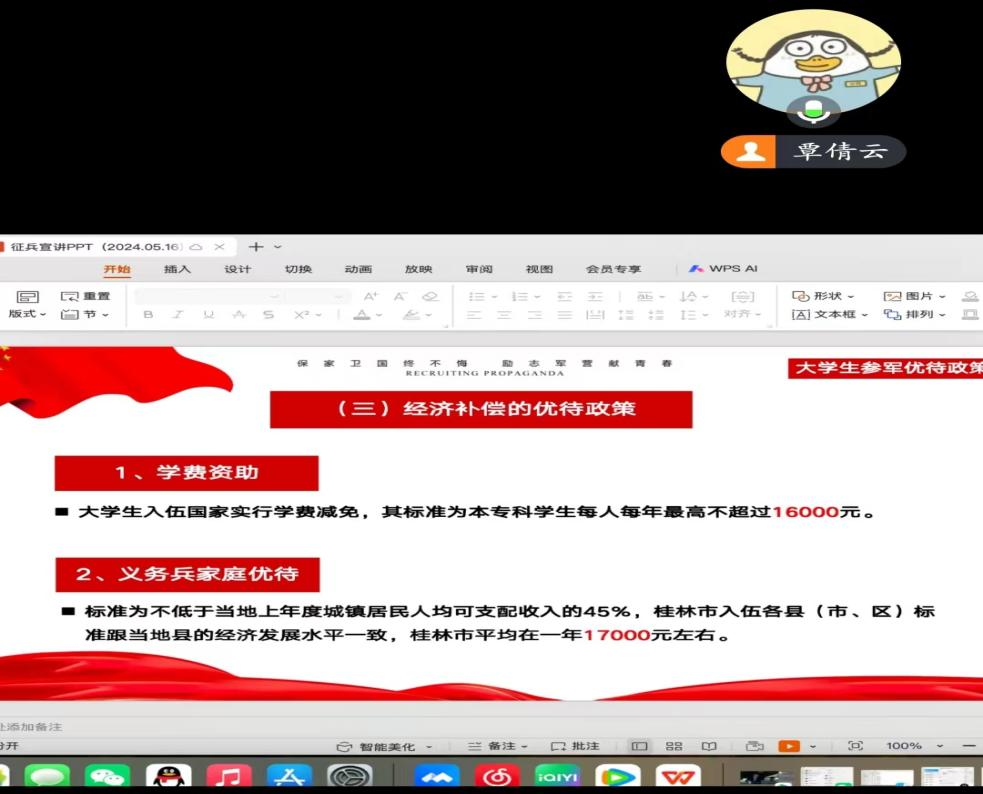 投笔从戎为国家,青年奋斗正当时,为响应国家号召,弘扬爱国主义精神,激发广大青年学生投身国防事业的热情,人文学院2021级汉语言文学专业于5月19日下午,以“腾讯会议”为平台,召开“征兵国防,安国兴邦”大学生征兵政策宣讲会,2021级汉语言文学专业全体学生参加。
