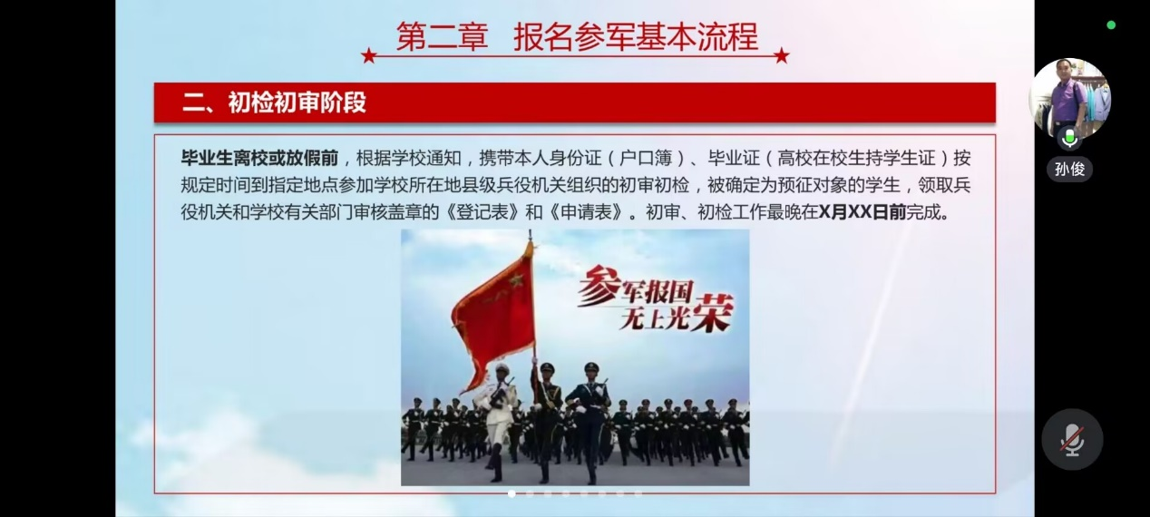 为进一步鼓励广大学生积极响应国家号召,投身国防事业,人文学院于6月10日晚通过腾讯会议举行2024年征兵动员宣讲会。会议邀请马克思主义学院教师孙俊主讲,人文学院各专业辅导员及学生代表参加。