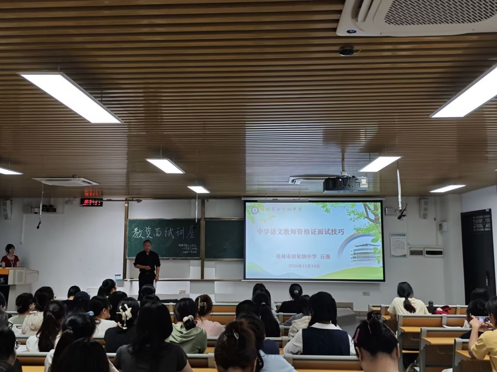 为进一步夯实师范生专业能力,掌握中学语文教师资格证考试面试要点,增强考试信心,切实提高面试通过率,11月14日,人文学院在至善楼1214教室举行2024年中学语文教资面试讲座。本次讲座特邀桂林市田家炳中学党务办主任、桂林市优秀语文教师石强主讲,汉语言文学专业学生参加讲座。讲座由行知社社团组织。