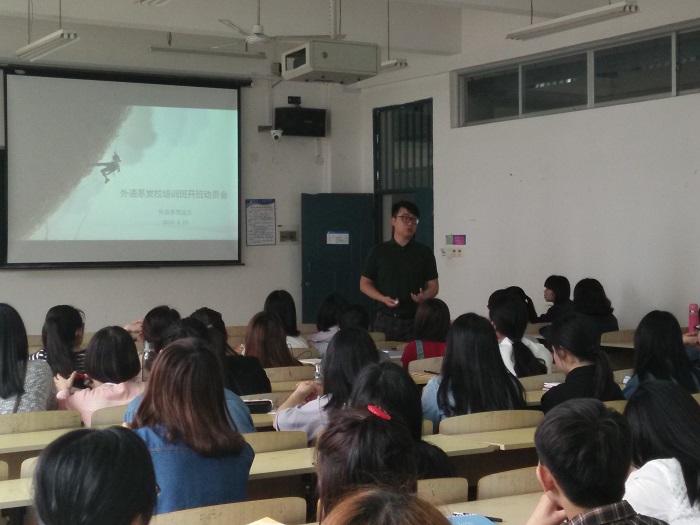 4月19日,外语系在1217教室举行了入党积极分子党校培训班动员大会。此次大会由外语系党总支书记陈俊杰担任主讲人,围绕“坚定党性,引领“两学一做”进行了专题会议,外语系参加第十五期入党积极分子培训班的79名学员参与了此次会议。