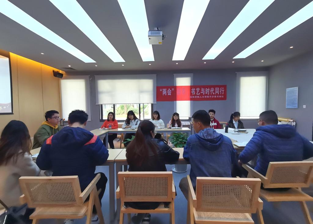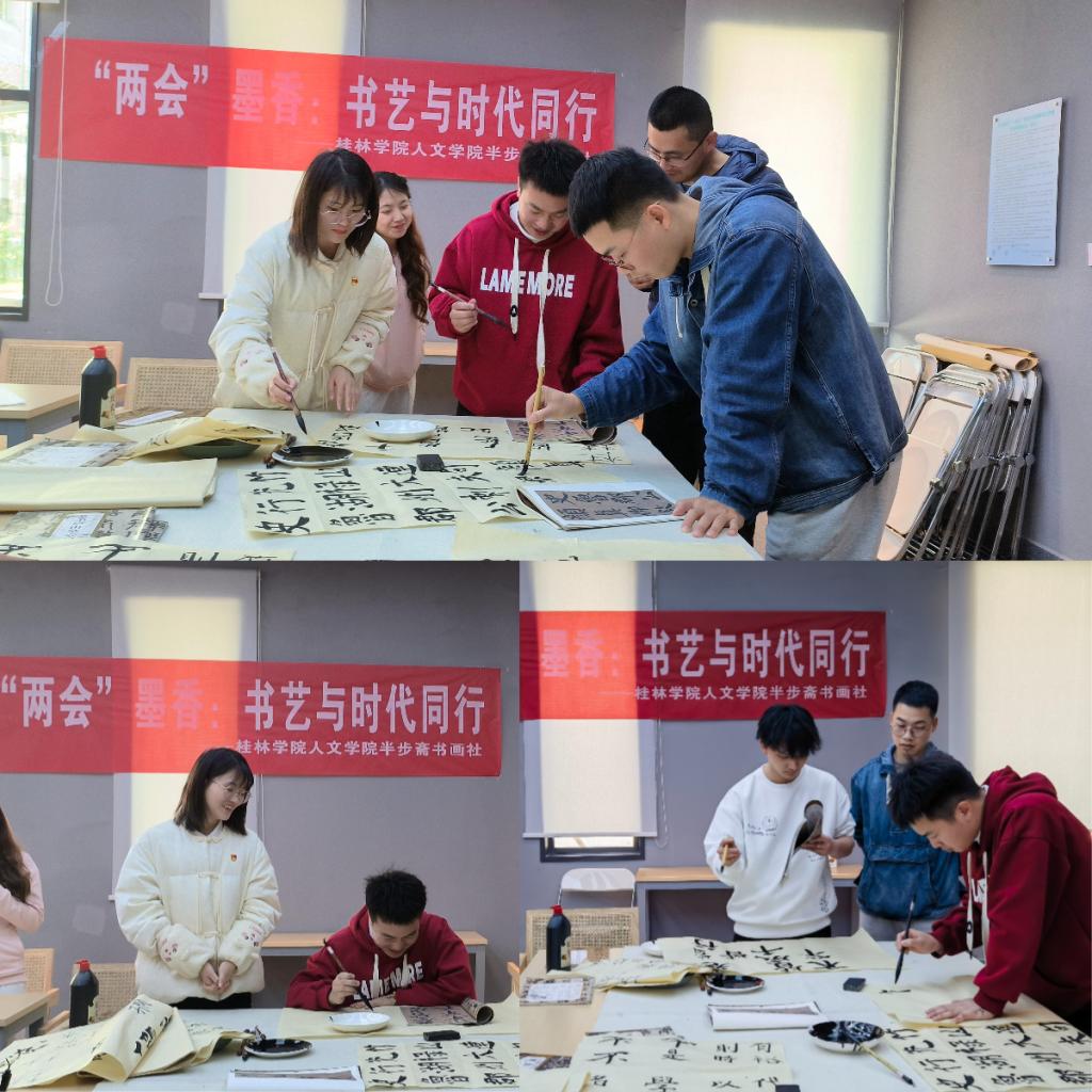 3月19日下午,人文学院半步斋书画社在杉湖家苑一站式学生社区开展“‘两会’墨香:书艺与时代同行”——书法交流会,用中国传统书法艺术来宣传全国“两会”精神,共同畅想美好未来。