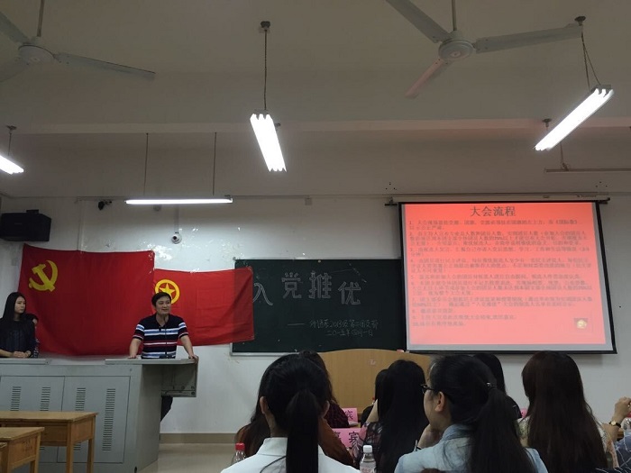 为加快党员队伍建设步伐,树立优秀团员榜样,广西师范大学漓江学院外语系2013级第二团支部于4月1日晚,在公共教学楼1504教室成功开展入党推优大会。外语系副主任肖立章老师、2013级辅导员庞菲老师、学生党员及团学干部代表作为嘉宾应邀出席本次大会,支部各成员全数到场。