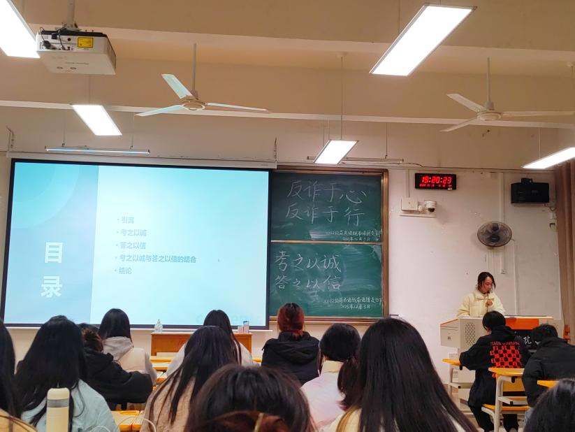 班会让同学们了解诚信内涵和重要性的同时,以真实案例进行深刻警示,号召大学生做到诚实守信的道德规范。学院辅导员深入班级,做到人员全覆盖,共同树立诚实守信的价值观。