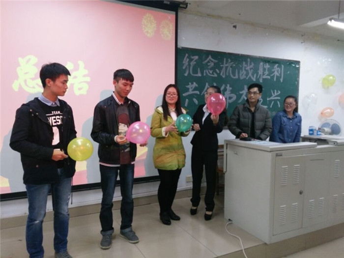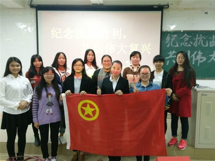 2015年11月1日下午19:10时,外语系2014级英语专业第一、第二团支部成功举办了以“纪念抗战胜利,共创伟大复兴”为主题的团日活动。