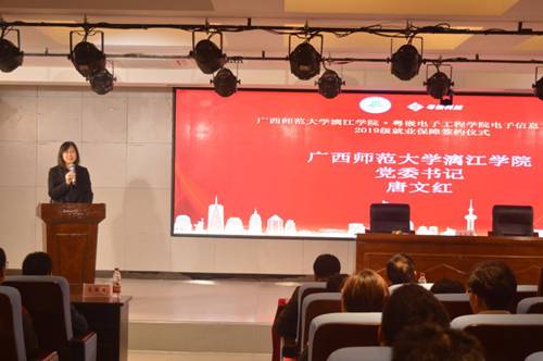 仪式在浓重的国歌中拉开序幕,唐文红书记代表学校领导对广州粤嵌公司与我校的合作表示热烈欢迎,她表示,这是我校与广州粤嵌通信科技股份有限公司合作进程中的重要一环,是具有里程碑意义的一件大事。这一份就业保障协议对广州粤嵌通信科技股份有限公司来说是一份责任,更是一份担当;它体现了广州粤嵌通信科技股份有限公司对高等教育尽责的一种情怀。唐书记也对我校首届粤嵌卓越班全体同学提出要求,她希望大家根据就业保障协议制定自己可行的学习计划及中长期目标,认真学习、不负韶华,一步一脚印地努力前行,用辛勤的付出来收获灿烂的明天。