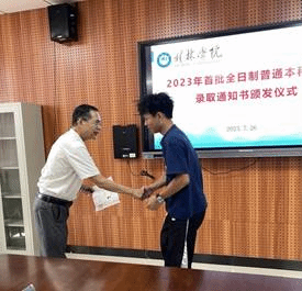 仪式上,杨树喆现场亲笔签发了录取通知书,并亲手颁发至三位2023级新生代表手中,向他们表示祝贺。杨树喆寄语2023级新同学,欢迎他们加入桂林学院大家庭,并勉励他们在大学期间要秉承向善、向学、自律、自强的校训精神,努力学习,刻苦专研,成为奉献祖国,服务社会的栋梁之才。何玲副校长代表学校致辞,介绍了学校的基本情况,并向三位2023级新生代表赠送桂林学院校徽和纪念品。